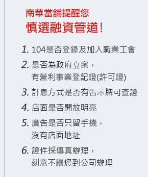林口南華當舖,依照政府明訂法規,絕非民間所謂的地下錢莊高利息,借款流程透明安全,讓您安心 沒負擔,如果您有資金上的需求,竭誠的歡迎您親臨本公司或來電洽詢,本公司服務人員將會為您詳 細解說。